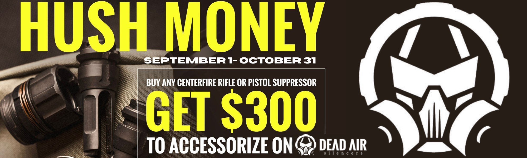 Buy a new Dead Air centerfire rifle or pistol suppressor and get a $300 promo code redeemable at DeadAirSilencers.com after mail-in rebate. The Dead Air Mask and RXD22Ti suppressors are excluded from this promotion and do not qualify. Valid one-time use only, any unused balance will be forfeited and cannot be redeemed at a later date. Limit one promo code per qualifying suppressor.