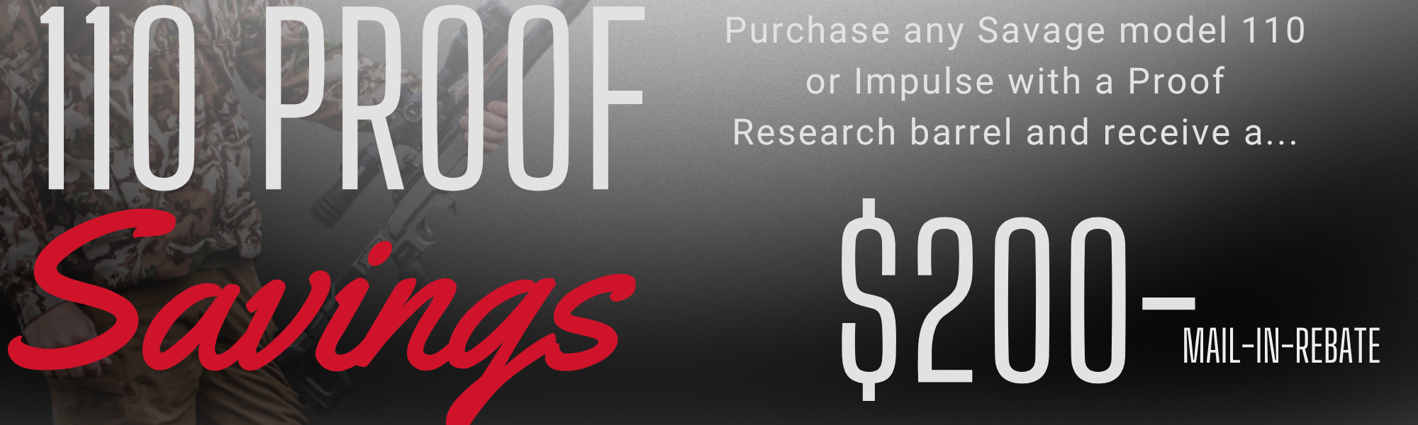 Purchase any Savage model 110 or Impulse with a Proof Research barrel and receive $200 MIR. Valid for purchases made November 1, 2025 through November 30, 2025. Rebate materials must be uploaded by December 30, 2025. Limit 5 per household. Online orders: email confirmations do not constitute proof of payment. To qualify for the rebate, order confirmation must be combined with the packing slip included in the shipped package to show amount paid and delivery confirmation. CONSUMER REBATE ONLY. CLUBS, GROUPS, ORGANIZATIONS and DEALER entries are VOID and will not be honored, acknowledged or returned. Purchases made through ExpertVoice®, Wholesalers, Distributors, Savage Arms, Inc. discount programs and retailer employee discount programs are excluded. Allow approximately 10 to 12 weeks for rebate processing. No duplicate or reproduced rebate forms will be honored (online rebate submission form acceptable). Void where prohibited and subject to all laws. Offer valid for U.S. and Canadian residents only. Rebate paid in U.S. funds only. This rebate may not be combined with any other offers or coupons affecting the same product. Savage Arms, Inc. may change the terms, conditions and duration of this offer at any time and without notice. Subject to product availability; quantities limited. Pre-orders, rain checks and/or backordered products will not be honored. NO EXCEPTIONS. Coupon cash redemption value is 1/100 of 1 cent.