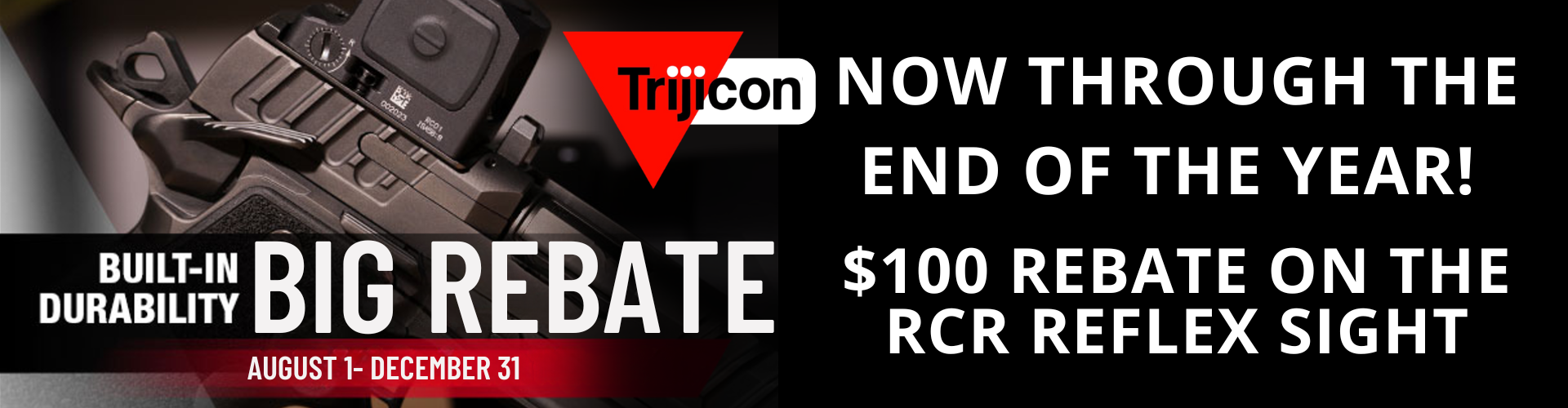 Rebate program for the popular Trijicon RCR® or Ruggedized Closed Reflex sight for a limited time. Beginning August 1 and running through December 31, 2025, a $100 consumer rebate will be available for the Trijicon RCR 3.25 MOA dot (RCR1-C-3300001). Only RCR optics purchased during this period will be eligible for the consumer rebate, and this offer is limited to five rebates per household.